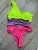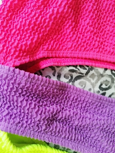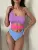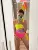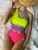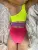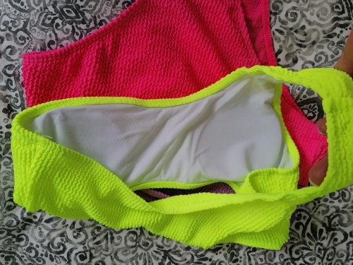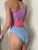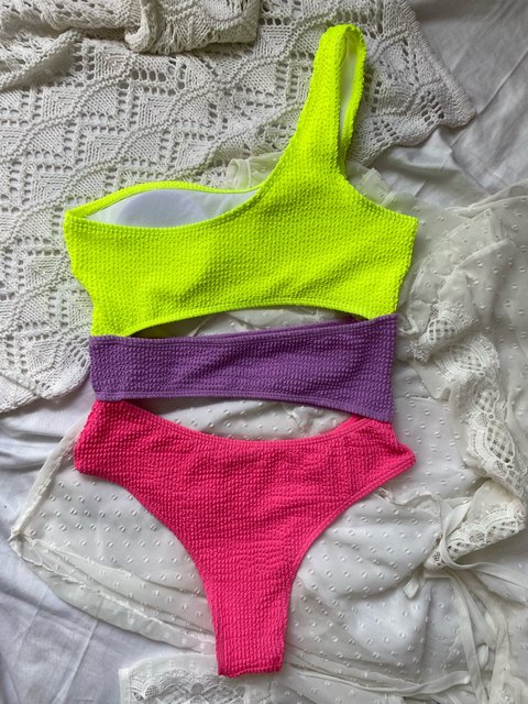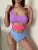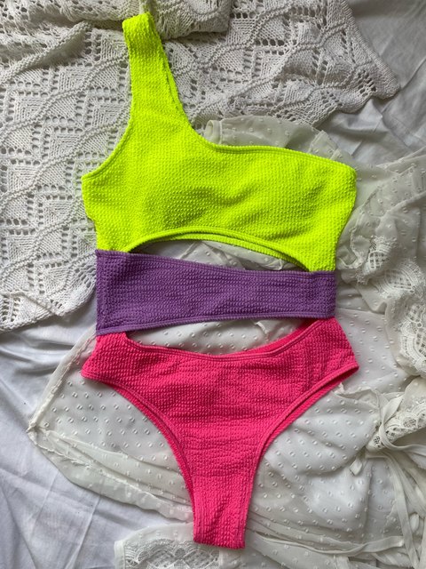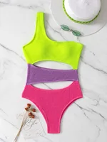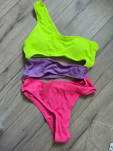 Jednoczęściowy, trzykolorowy strój kąpielowy.